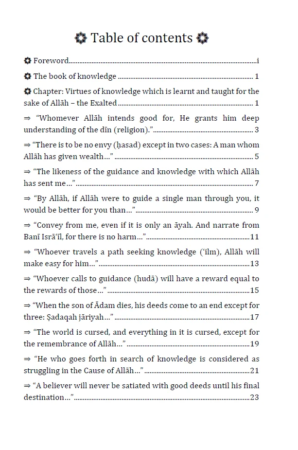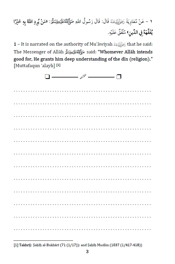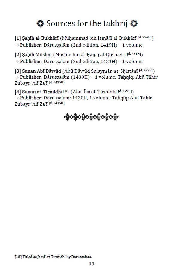 This edition presents carefully researched aḥādīth wordings from reliable editions like from the prestigious Maktabah Niẓām Ya’qūbī [Bahrain], majority of the content with tashkīl, followed by space for notes. It is made for students, teachers, and serious readers who want the text and room to write notes.